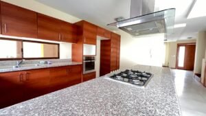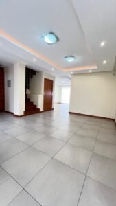 Primer Piso: Sala con luces led, baño social, bodega, comedor con acceso de ventanales al patio y cocina equipada, cuarto de servicio, área de máquinas, área de BBQ.